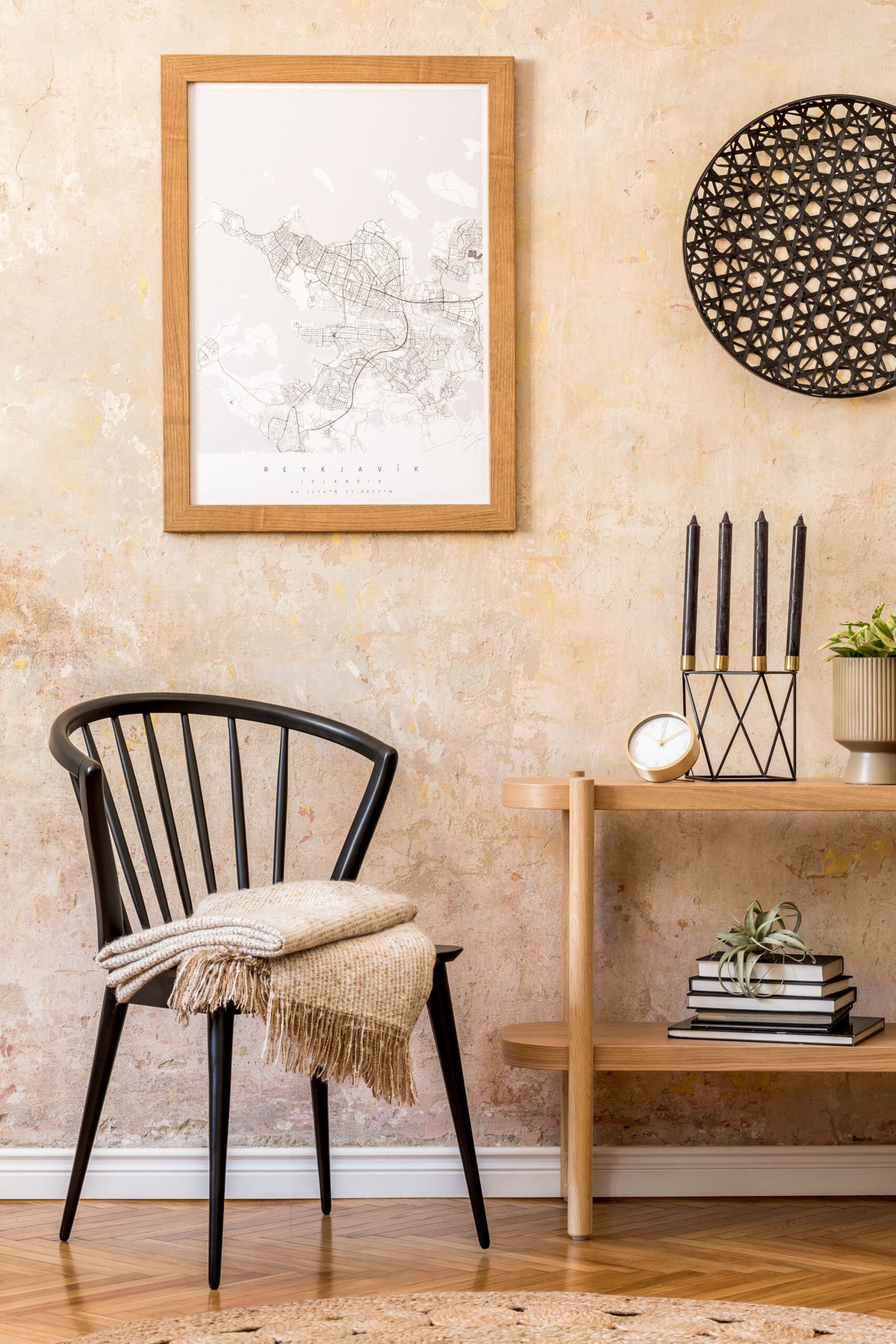 Interior design of living room with stylish black chair, wooden console, books, plant, clock, decoration, grunge wall and elegant personal accessories in modern home decor.