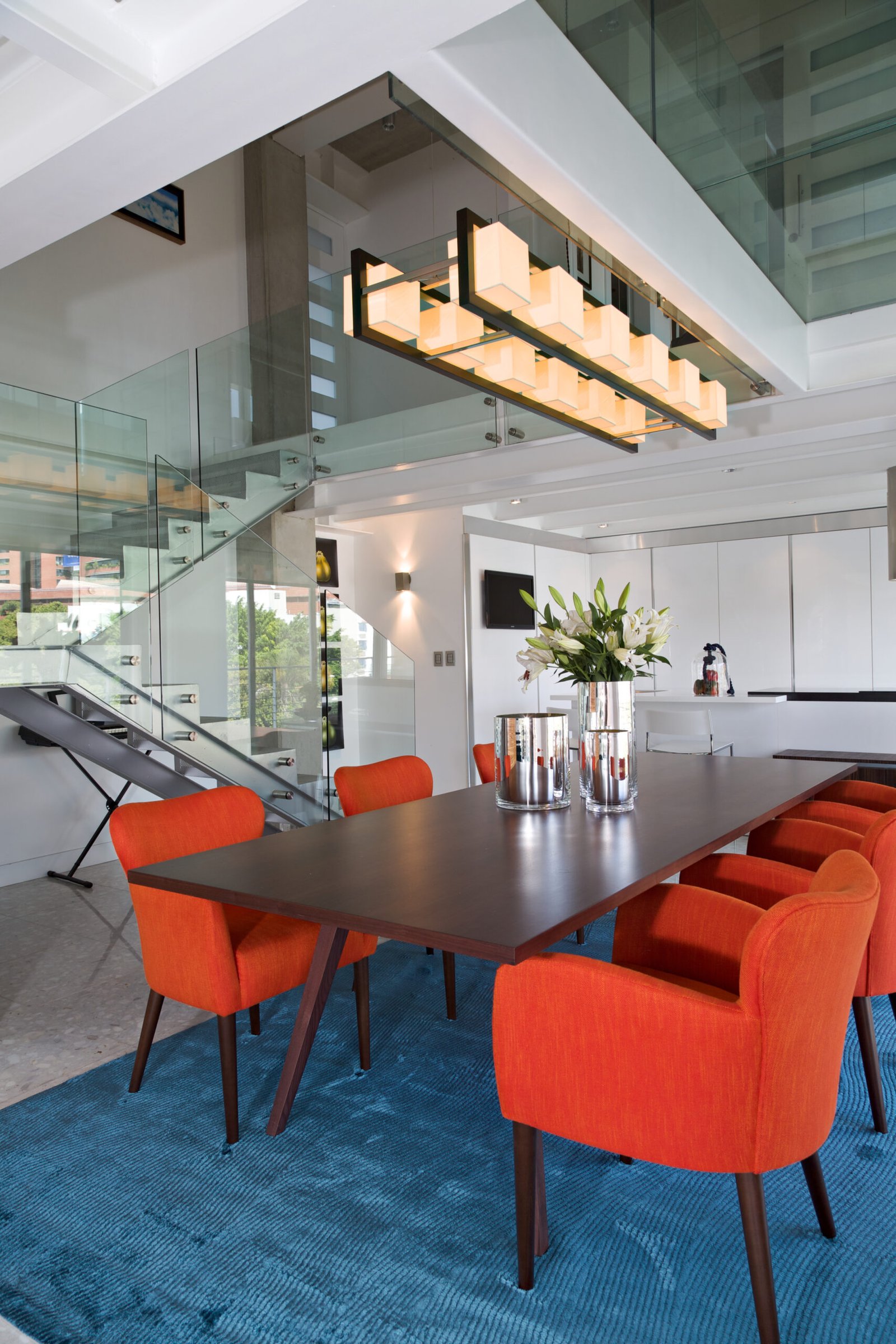 Modern and bright dining room of luxurious apartment. Interior design and decoration, dark wood table and orange chairs on blue carpet.