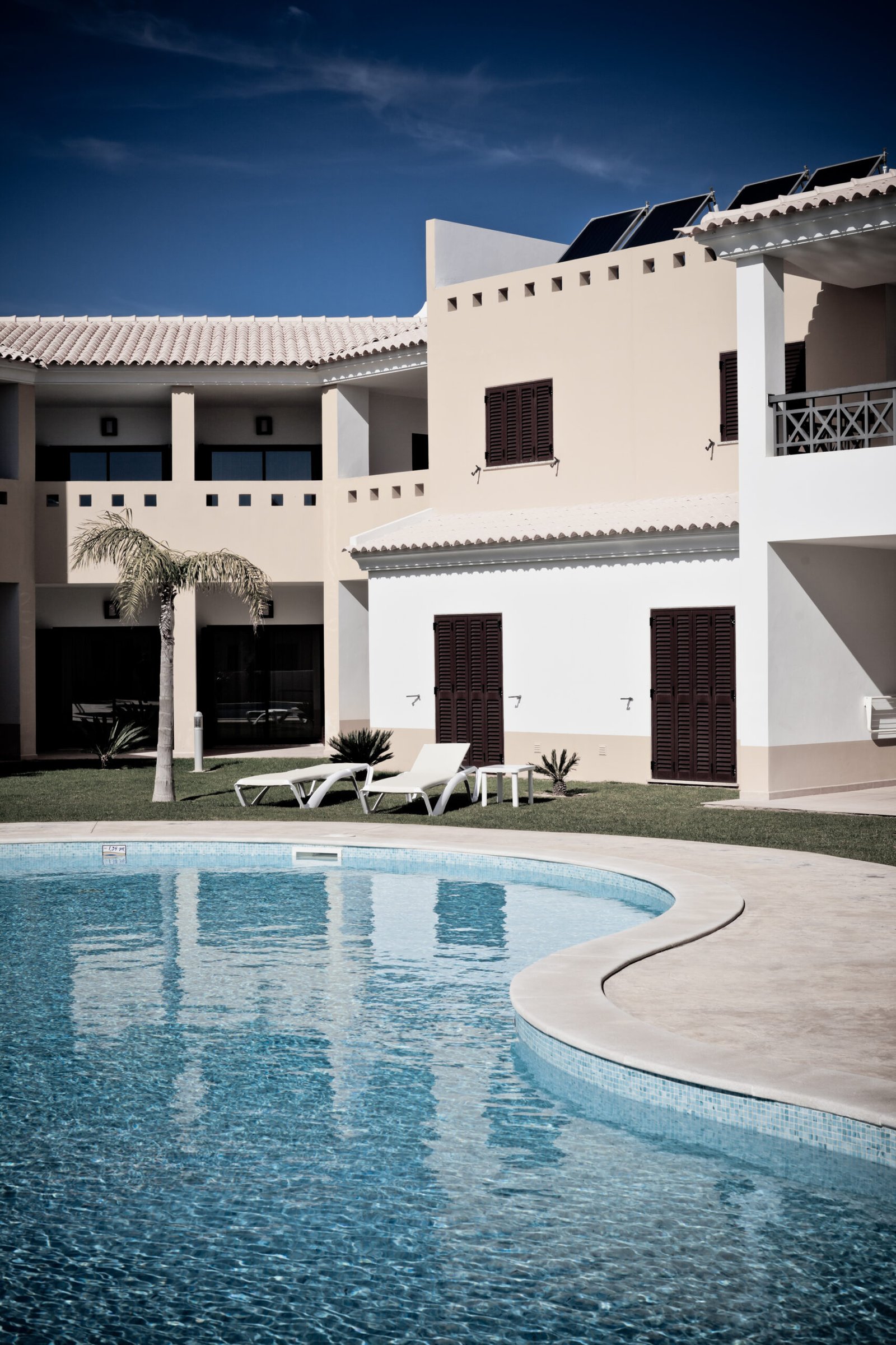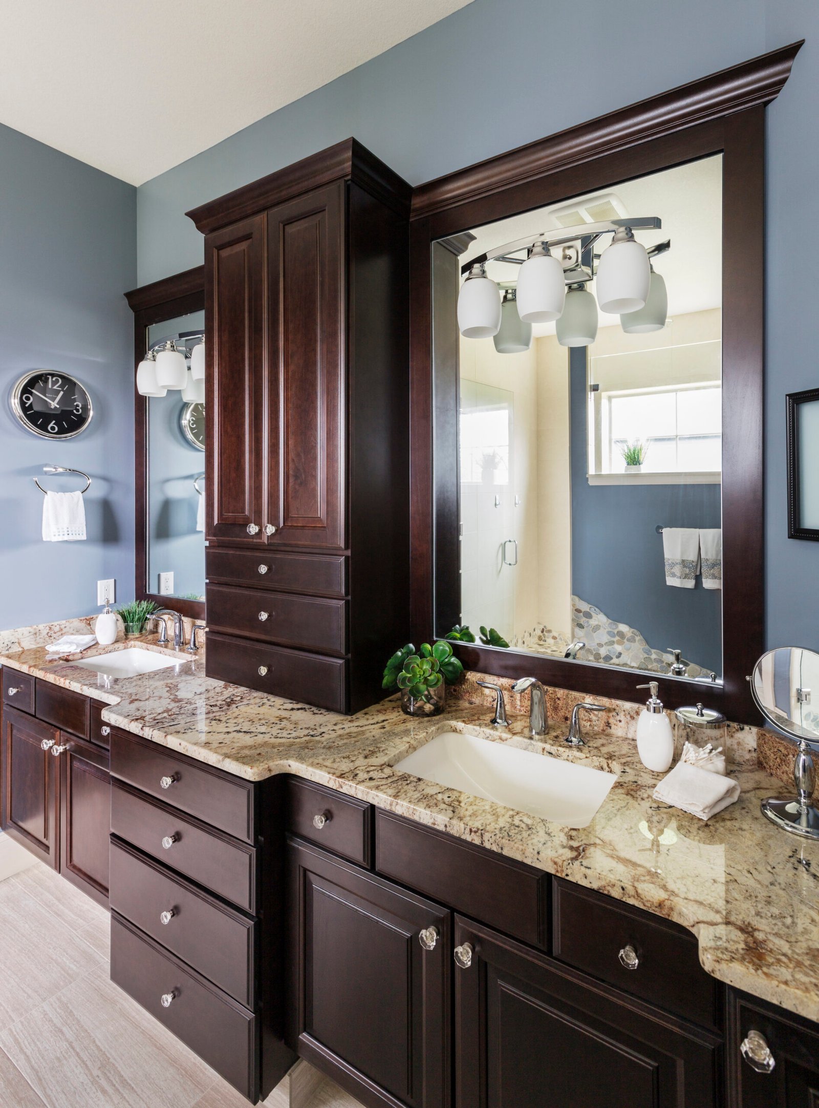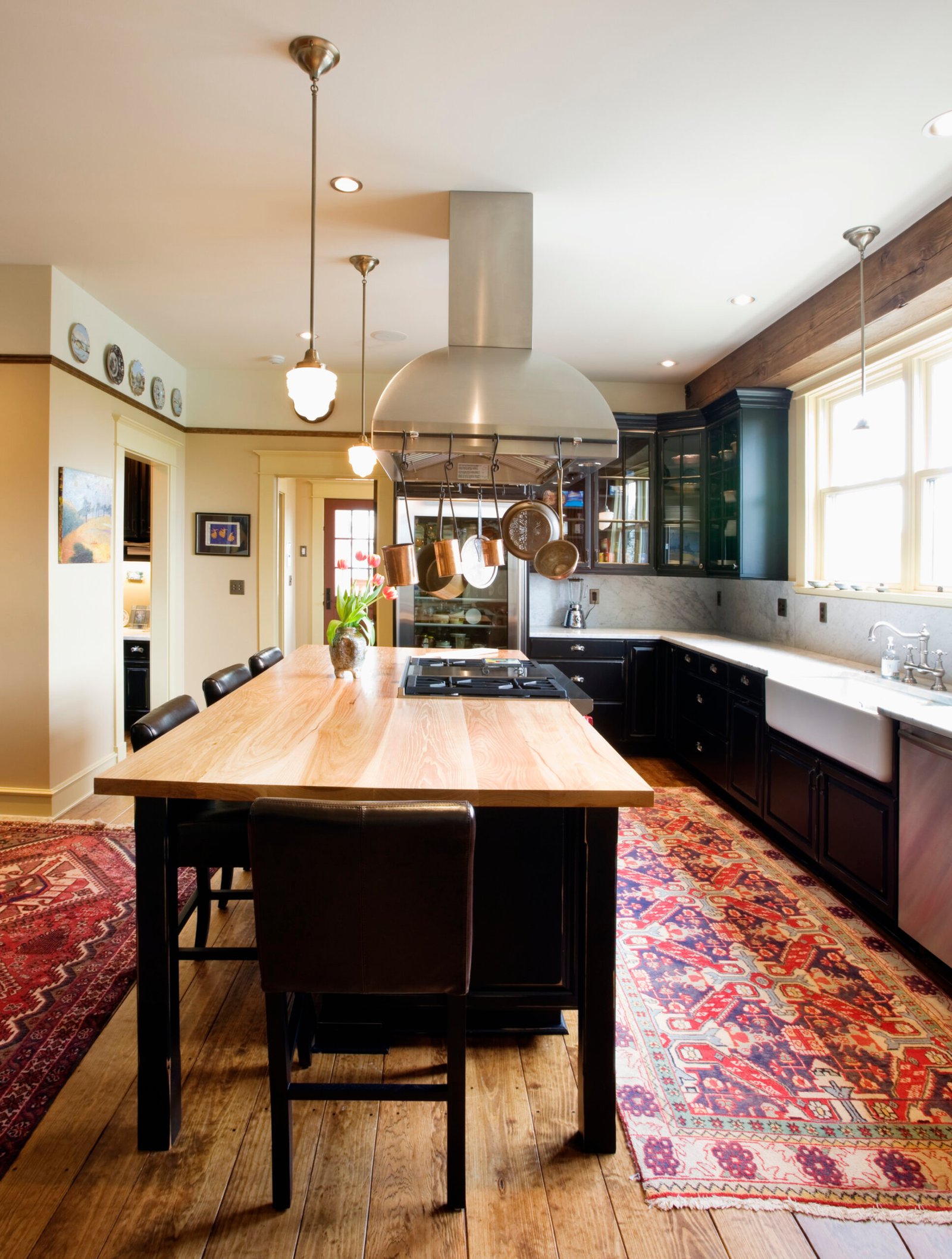 Modern and bright dining room of luxurious apartment. Interior design and decoration, dark wood table and orange chairs on blue carpet.